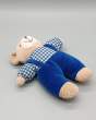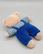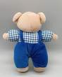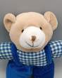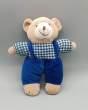 Magnifique Doudou Ours de couleur beige Habillé en Salopette Bleue et Chemise Vichy. Son corps souple et moelleux en fait un Compagnon Parfait pour les Câlins. À l’intérieur, un petit Grelot intégré produit un tintement apprécié des bébés comme des enfants.