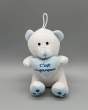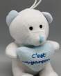 Petit Ourson de Naissance en position assis Blanc avec oreilles et plantes des pattes bleu ciel. Ce petit ourson présente un Gros Cœur bleu ciel avec une inscription « C'est un Garçon ». Une Attache est présente pour le pendre à l’endroit de votre Choix.