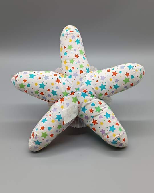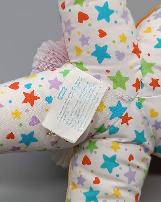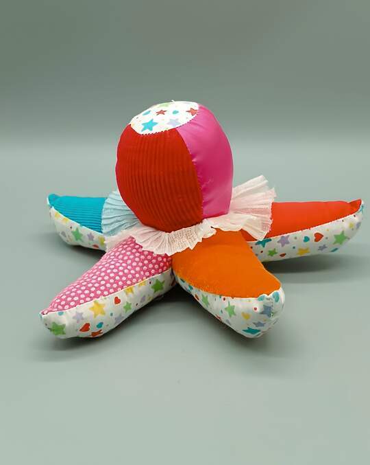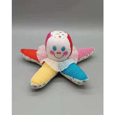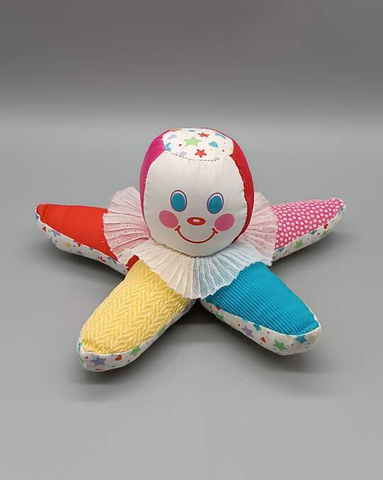 La peluche Étoile de mer ou Pieuvre de la Marque Playskool est un Doudou Vintage des Années 1990. Ce jouet représente aussi la tête d'un Clown Étoilé, avec un visage souriant et des bras Multicolores. Sa tête est sonore quand Bébé va lui faire un pouet pouet !